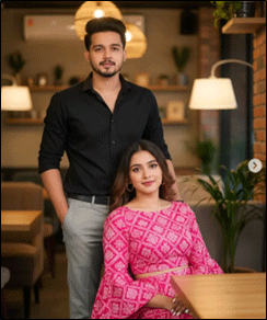 Hyperrealistic foulbodyportrait of astylish Indian coupleiractic indor cafe.